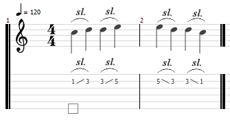 上のTAB譜は、スライドバーの基本的な練習フレーズです。練習する際は、音程がズレないように正確な左手の移動が大切です。スライドバーが傾いていると、左手が移動しづらくなるので、フレットに対して平行になっているかを確認しながら練習しましょう。