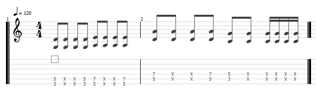 ブラッシングを練習する際は、まず発音の切り替えから練習しましょう。上の譜面は、弦をミュートしたり押さえたりする基本的な練習フレーズです。楽譜の「×」の記号はミュートをしてブラッシングを演奏する箇所を表しています。