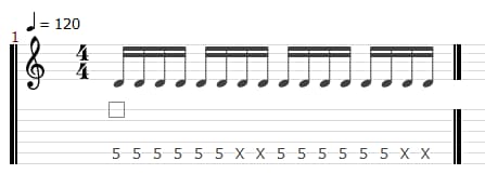 16分音符をベースとしたシンプルな単音カッティングフレーズから練習を始めましょう。ストロークする手の動きが一定になるように意識することがコツです。
