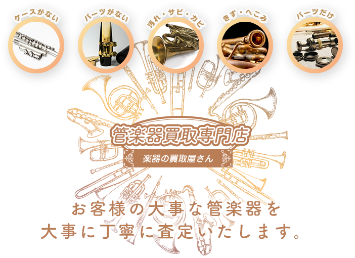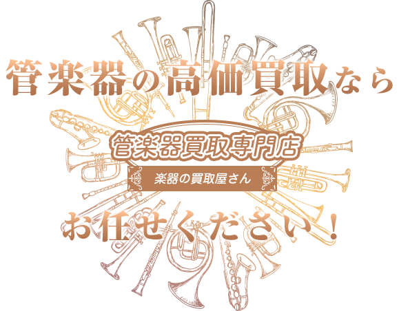 管楽器買取専門店 楽器の買取屋さんでは、サックス・フルート・トランペット・ホルン・クラリネット・トロンボーン・オーボエ・チューバ・ピッコロなど幅広い管楽器の買取を致しております。他にも管楽器の名前や種類が分からない。楽器ケースが無い。汚れている。くすんでいる。もしかすると価値がないのでは?と思われる場合であっても、お気軽にお問合せ下さい。