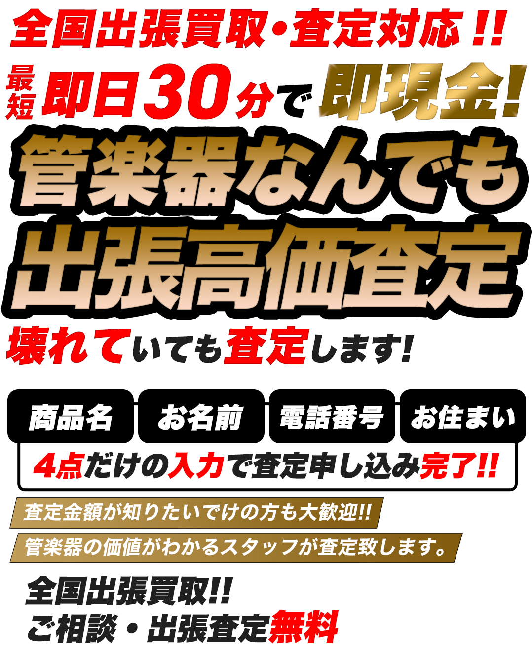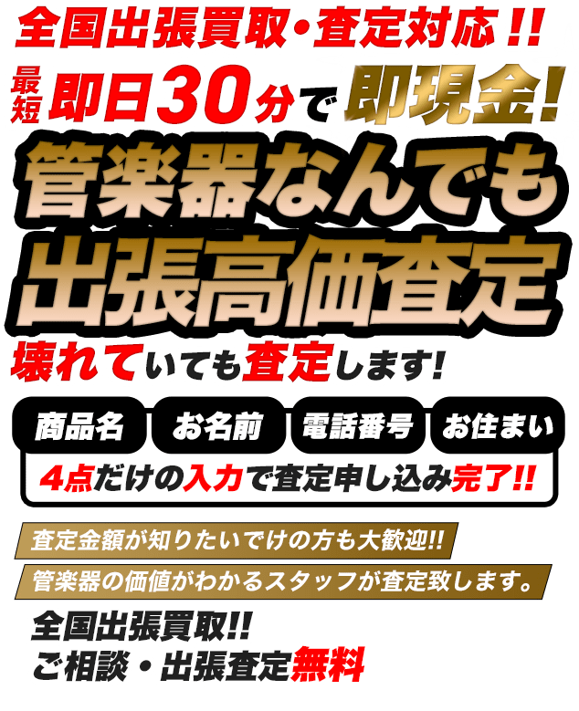 管楽器買取専門店が最短30分で出張査定、即座にご対応させていただきます。