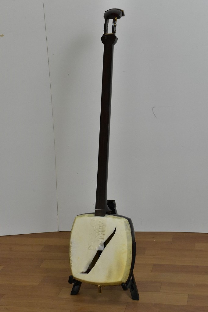 山形県天童市のお客様より、宅配買取にて、津軽三味線/太棹 紅木 東さわり 子持ち綾杉胴 二枚溝 金細 りんどう金物付き ハードケース付属の査定をさせていただきました。棹幅(最細部)が約30mmでしたので、津軽三味線(太棹)であると判断しました。使用感・経年感の見受けられる外観で、胴内接合部のヒビ割れ、皮の破れ、棹の継ぎ目の割れ・ささくれ等、一部損傷があり、糸巻が欠損いたしておりました。棹は紅木でトチが出ておりましたが、、二枚溝の継ぎ手、子持ち綾杉胴、東さわり、金細、りんどう金物付きといったスペックとなっており、天神に損傷等は見受けられませんでしたので、胴・棹・音緒・駒・天神カバー、ハードケースが付属が付属した状態でお引取りをさせていただきました。楽器の買取屋さんなら、ご遠方からのご売却の場合でも、ご自宅から直接着払いでお送りいただくだけで査定ができますので、ぜひご連絡ください!