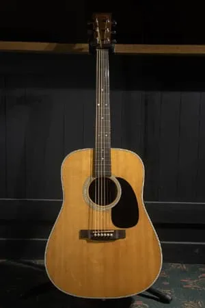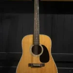 D-28は、豊かで力強い低音とバランスの取れた響きが特長で、弾き語りからバンド演奏まで幅広く対応できる万能なアコースティックギターとして高い評価を得ています。中古市場でも安定した需要を誇る一本です。
